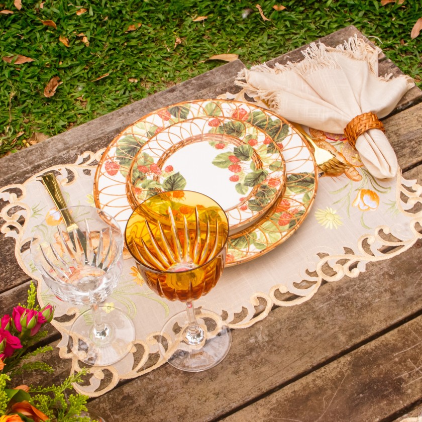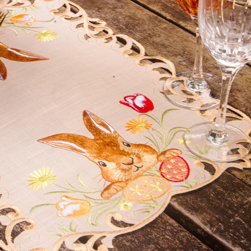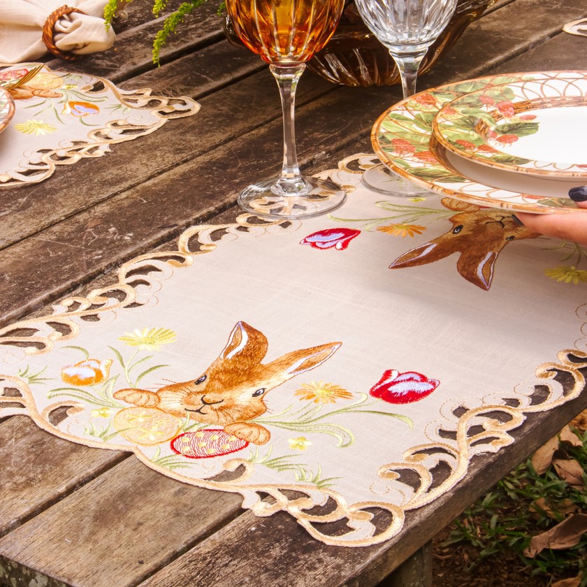 Charmoso e elegante, o jogo americano Páscoa Garden, com acabamento bordado nas laterais e corte a leiser, composto por 100% de poliéster, com toque e aparência do linho. Modelo ideal para compor a sua mesa de Páscoa, celebrando esse momento tão especial. Compondo seu ambiente com delicadeza e suavidade. Eleve seu ambiente com a beleza e requinte das roupas de mesa bordadas.