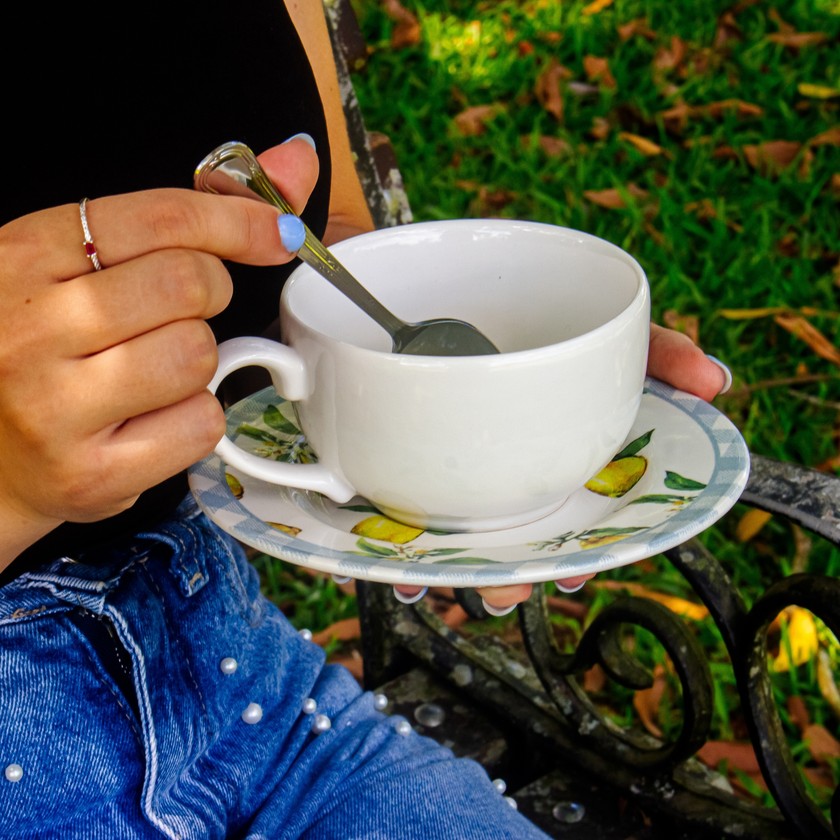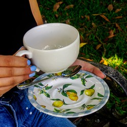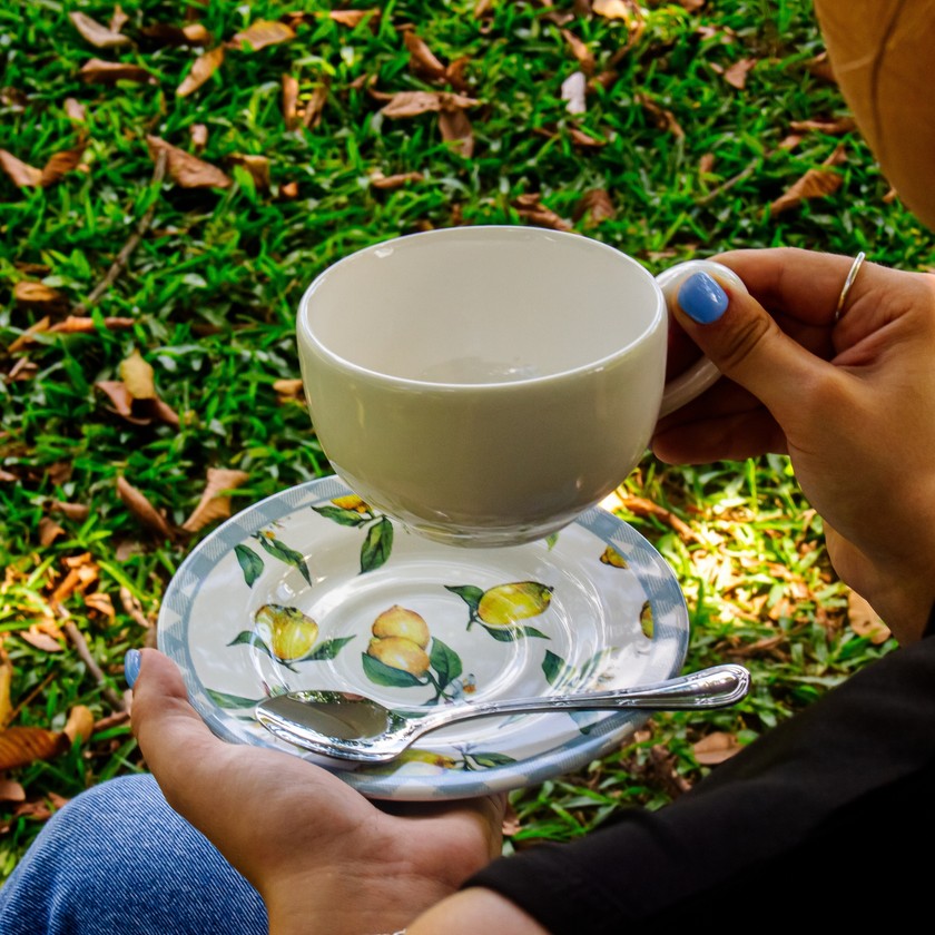 Delicado e charmoso, a xícara e pires Amalfitana, carrega o frescor do limão siciliano, trazendo levesa as composições de mesa. Composto por 100% de cerâmica, ideal para compor a sua mesa posta, tornando este momento em uma verdadeira esperiência. Compondo seu ambiente com delicadeza e suavidade. Eleve seu ambiente com a beleza e requinte das louças.