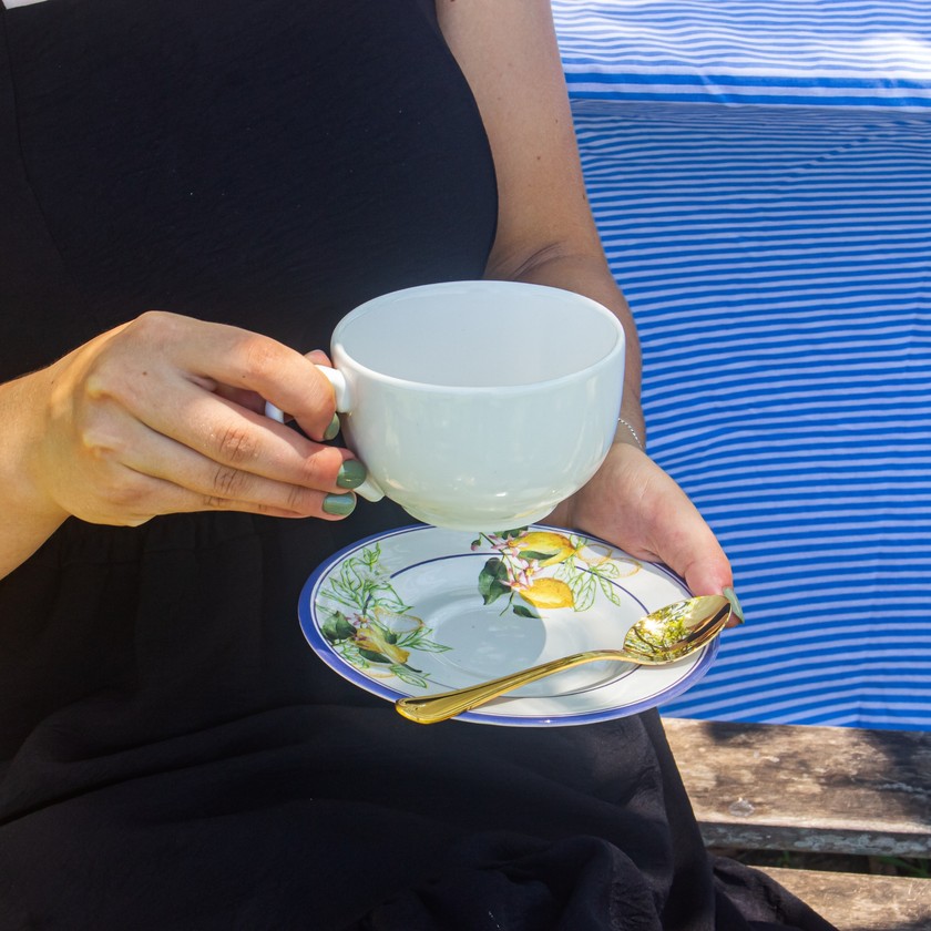 Esta xícara com pires não é apenas um recipiente, mas uma porta de entrada para momentos de tranquilidade e prazer, envoltos na aura ensolarada e refrescante do limão siciliano.
